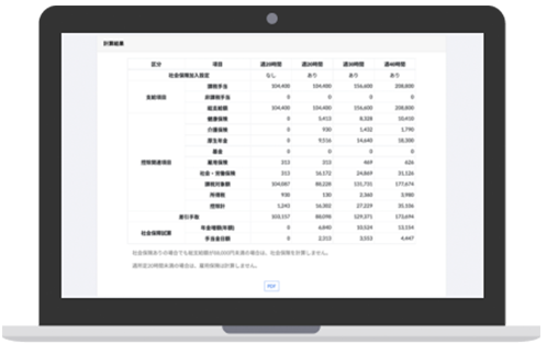 時給・年齢指定による週所定労働時間別の手取り額や、社会保険料の試算ができます。